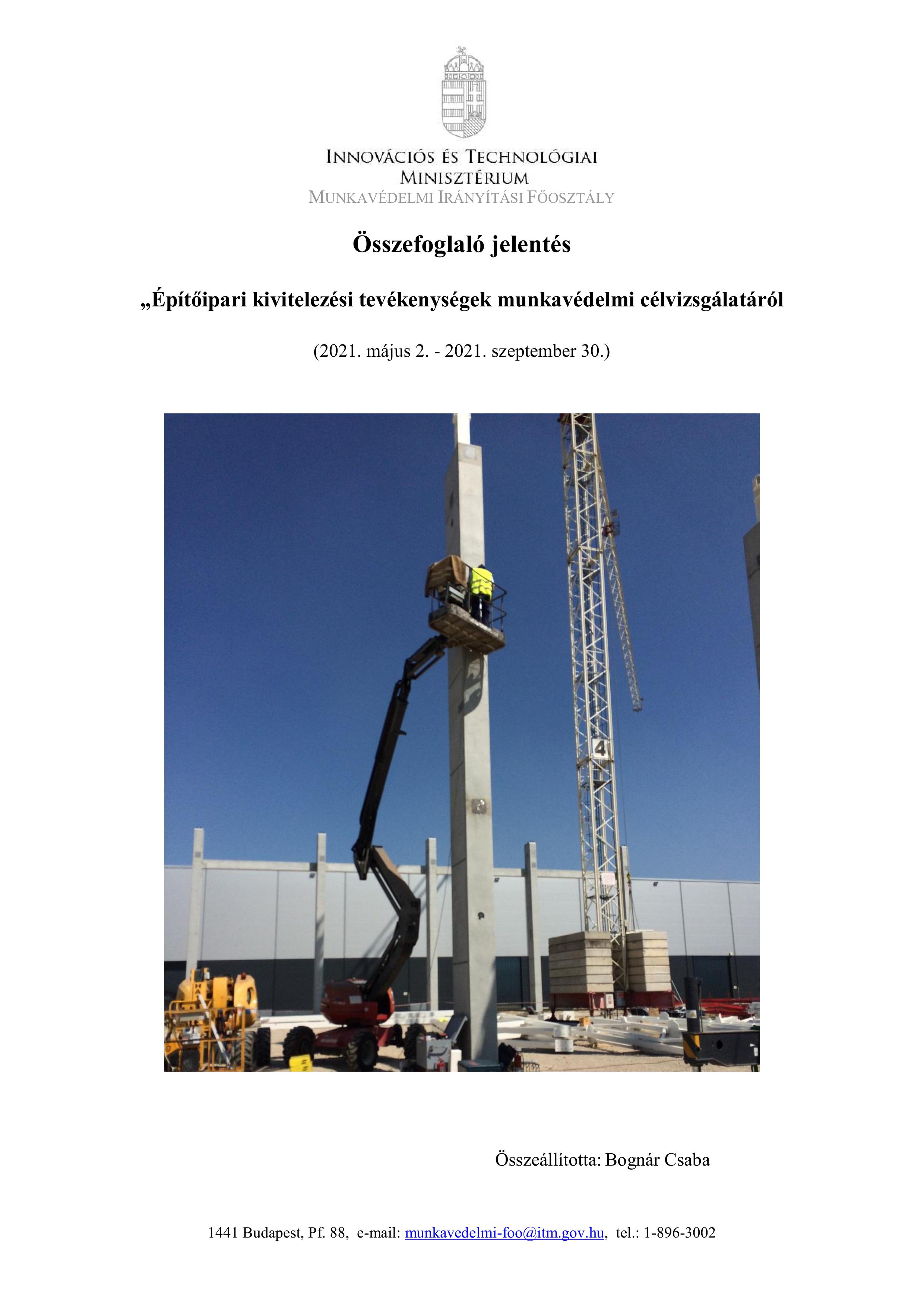 Az ITM Munkavédelmi Irányítási Főosztálya 2021. május 2. - 2021. szeptember 30. közötti időszakban az építőipari kivitelezési tevékenységek körében munkavédelmi célvizsgálatot végzett. A vizsgálatról készült összefoglaló jelentés a napokban jelent meg. A jelentés a borítóra kattintva letölthető.